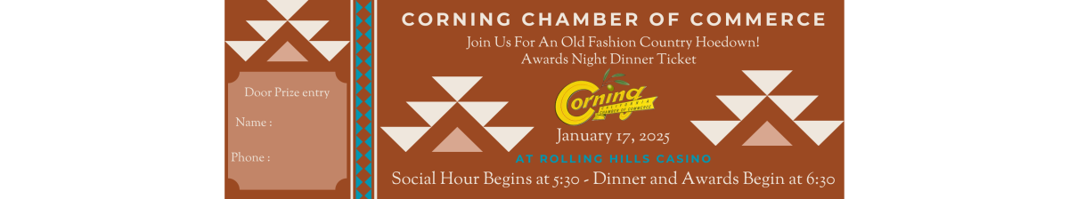 The Corning Chamber's Annual Community Awards Dinner will be held Saturday, January 17 at the Rolling Hills Casino Event Center. This event is an opportunity to thank our Business, Emerging Business, Non-profit, Volunteer and Youth Volunteer of the Year recipients.